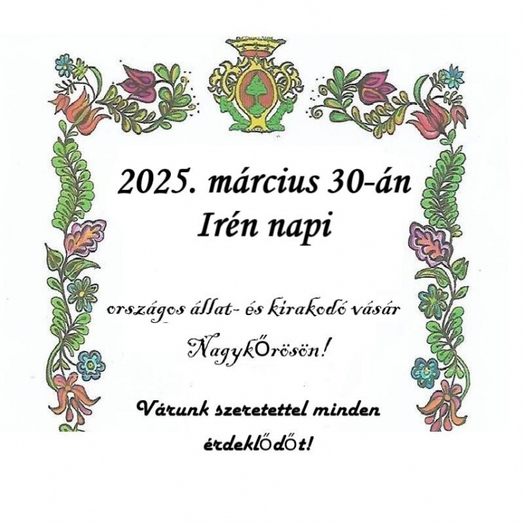 Kérem fentiek szíves elfogadását, egyben invitálom, hogy látogasson ki Ön is a nagykőrösi Irén napi vásárba 2025. március 30-án! Várjuk szeretettel!