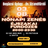 Hajdúszoboszlón zenés éjszakai fürdőzés a Hungarospa-ban, nyáron a strandon, a téli időszakban a Fürdőkomplexum Aqua-Palace fedett élményfürdőjében. Látványos programokkal, sztárvendégekkel, táncosokkal várják a fürdőzés szerelmeseit és az itt üdülőket egész évben, Hajdúszoboszlón. A zenés éjszakai fürdőzések a hajdúszoboszlói strand tradicionális részén lesznek megtartva pénteken és szombaton 21.00– 24.00 között.