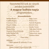 Ünnepi műsor és az Ajkai Képzőművészeti Egyesület kiállításának megnyitója Ajkán, a Nagy László Művelődési Központban a Magyar Kultúra Napja alkalmából 2025. január 22-én 17.00 órától. Beszédet mond és a tárlatot megnyitja: Horváth Tibor tanár. VERSmindenÁRON címmel Sövegjártó Áron színművész önálló estje.