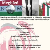 Tisztelettel meghívjuk önt és kedves családját az 1956-os forradalom és szabadságharc tiszteletére megrendezett ünnepi megemlékezésre a berekfürdői Millenniumi Emlékműhöz 2025. október 22-én 10:00 órára. Ünnepi beszédet mond: Kun László önkormányzati képviselő. Közreműködnek: Koszna Anita és a Veress Zoltán Általános Iskola tanulói.
