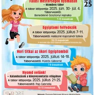 Szünidei napközis alkotó gyermektáborok Ajkán, a Nagy László Városi Művelődési Központ és Könyvtárban általános iskolás gyerekeknek. 2025. június 30-július 4. között kézműves táborba, július 21-25. között pedig Bőrműves táborba várjuk a gyerekeket. Részvételi díj: 38.000 Ft, mely tartalmazza az étkezést, anyagköltséget és a kirándulás díját. Előzetes jelentkezés szükséges!
