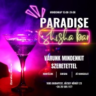 Gyertek el egy felejthetetlen randira a Paradise shisha bárba, ahol a legjobb shisha és koktél élmény vár rátok! Válasszatok 15 féle vízipipánk közül! Klasszikus vízipipánk mellett megtalálhatóak az alkohollal készült pipák is, mint például a Mojito vagy a Long Island Iced Tea. Ne hagyjátok ki ezt a szuper ajánlatot!