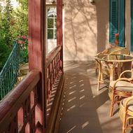 A Budai oldalon, zöldövezetben, a Gellért-hegy lábánál, csendes, fasorral szegélyezett utcában található. A fedett terasz, mely a társalgóból egyenesen a kertre nyílik, kellemes hely kávézáshoz, olvasáshoz esős időben is. A kertbe régi szecessziós vaskorlát vezet le, ahol a fák árnyékában, kényelmes teak-fa kertibútorok várják a vendégeket. Minden szobában Internet (WiFi) és légkondicionáló található. A falakat híres magyar kortárs festők képei díszítik. Néhány szoba erkély illetve balkon is tartozik, melyek a kertre, vagy az utcai fasorra nyílnak.