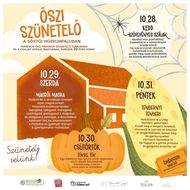 Szünetelje velünk! Az őszi szünet ideje alatt is biztosít programokat a Sóstói Múzeumfalu. Minden nap valamilyen tevékenység elvégzésére invitáljuk a szünetelő diákokat. Válaszd ki a számodra szimpatikus napot/napokat és szünetelj velünk te is! Gyertek! Alkoss, barangolj és kóstolj az ősz színeiben pompázó Sóstói Múzeumfaluban.
