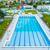 Strandfürdőnkben négy vízforgató berendezéssel ellátott medence és egy gyógyvizes termálmedence áll a vendégek rendelkezésére. Az úgynevezett pipa alakú élménymedence két csúszdával, nyakmasszázzsal és hangulatos lámpákkal biztosítja a szórakozást. Az 50 méteres medence nyáron nyitott, a téli szezonban sátorral fedett, így egész évben biztosítja az úszás lehetőségét, csakúgy, mint a termálmedence. A szabványos hosszúságú ötven méteres úszómedence sportversenyeknek is helyet ad. Ezek mellett még egy ülőpados melegvizes medence, illetve egy gyermekmedence is megtalálható a fürdőben.